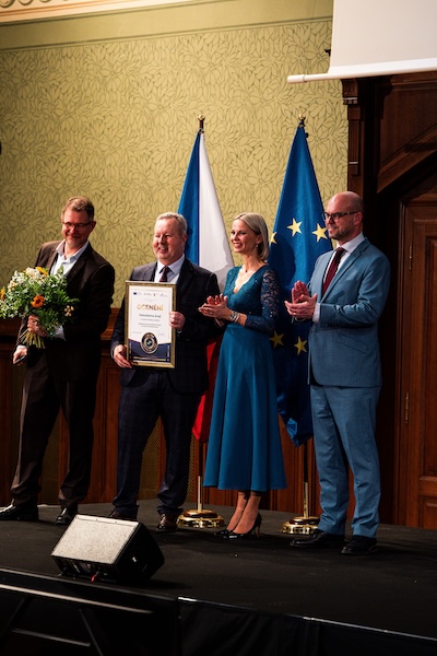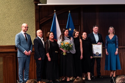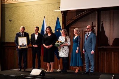 Město Jičín za projekt Strategie odpovědného stravování v zařízeních školního stravování ve školách města Jičína v kategorii „Udržitelná veřejná zakázka“. Ocenění převzali Lenka Hollerová a místostarosta města Jičína Petr Hamáček.